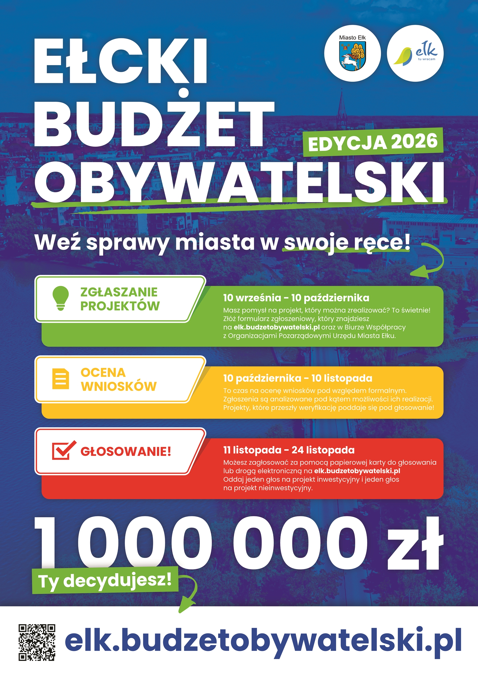 Już za chwilę rusza Ełcki Budżet Obywatelski - edycja 2026. Kwota środków przeznaczonych na inwestycje wskazane przez mieszkańców wynosi 1 000 000 zł.